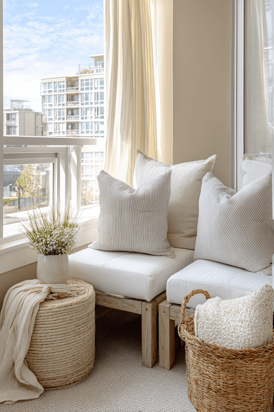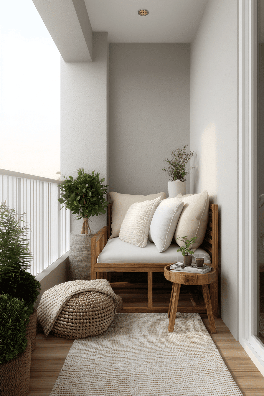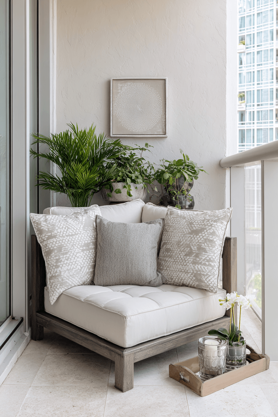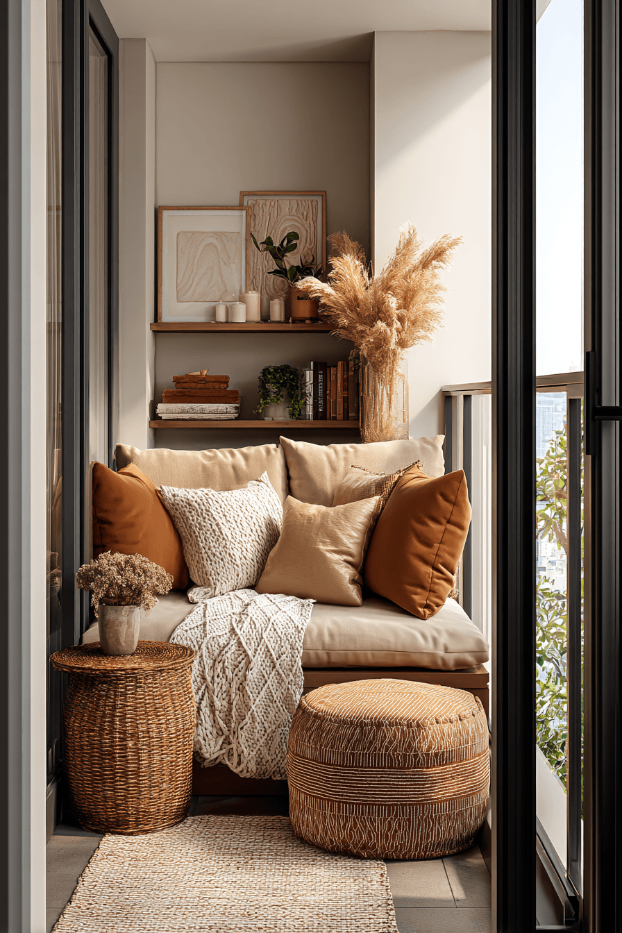 This cozy setup creates a small yet inviting patch of comfort, perfect for very small balcony decor that feels personal and relaxing. Soft cushions and layered textures turn even a simple chair into a spot you’ll want to linger in. Keeping everything grouped together helps define the area without making it feel cramped. Neutral tones keep the look calm, while a few textured elements add depth. A small side table can hold your drink or a book, making the space feel complete. The mood is warm, simple, and quietly comforting. Tap to design your own cozy corner.