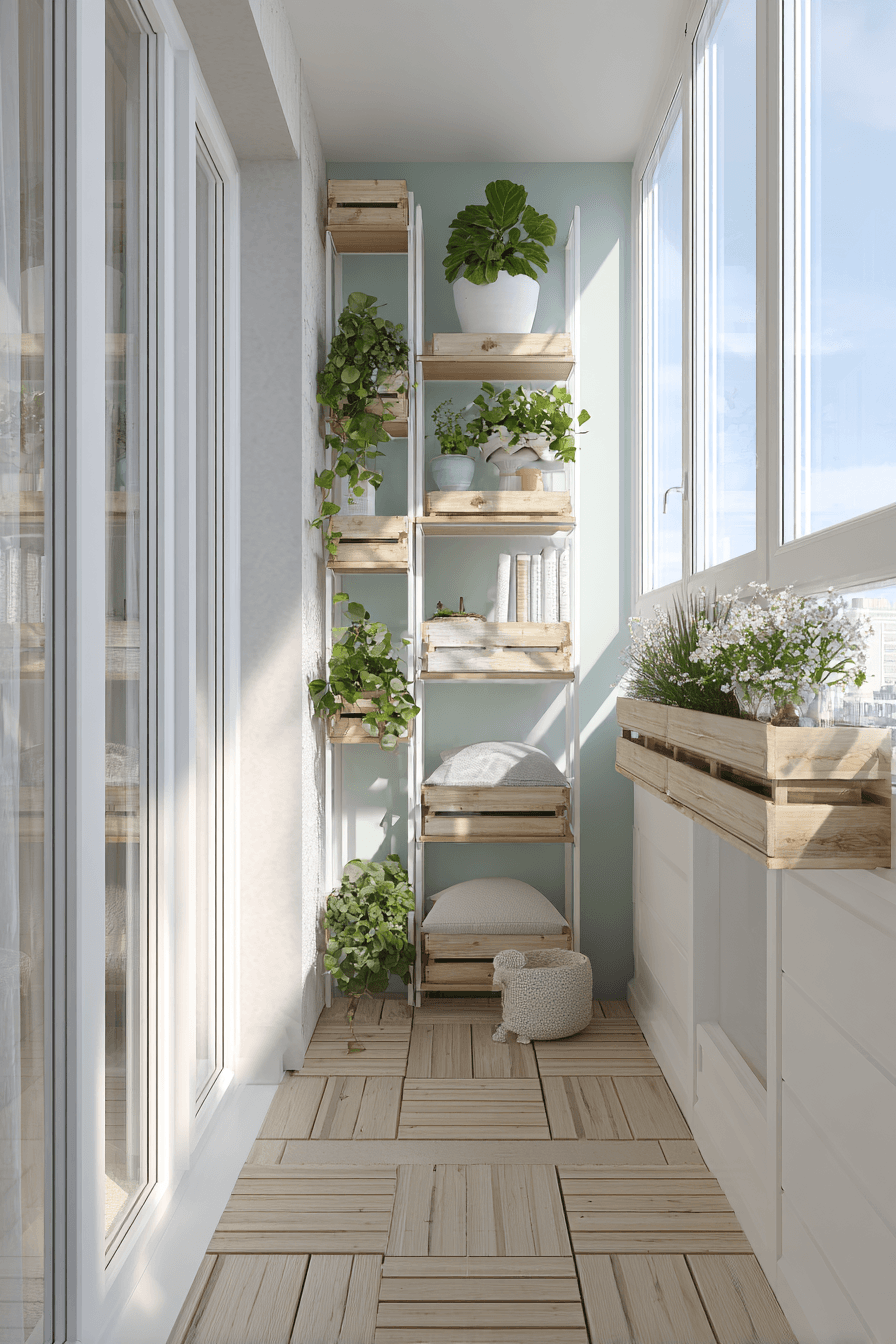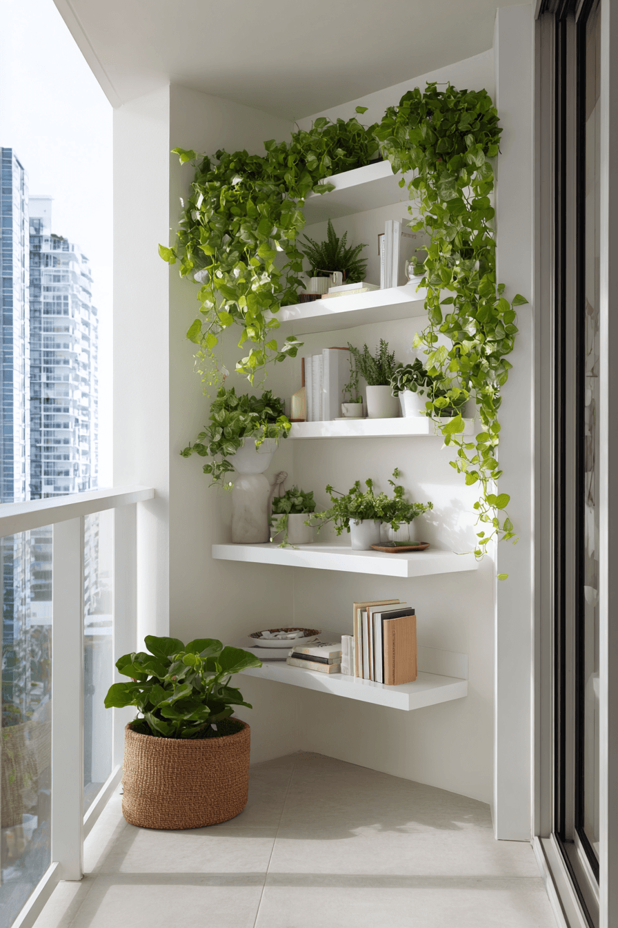 This layout makes the most of vertical space, adding shelves or wall-mounted planters to enhance very small balcony decor. Drawing the eye upward instantly makes the balcony feel taller and more open, which is a game changer in tight spaces. You can mix greenery with small decor pieces to create a layered, lived-in look without taking up floor space. Lightweight materials keep everything feeling airy rather than bulky. The mood feels fresh and lively, especially with pops of green bringing the space to life. It’s a smart way to decorate without sacrificing movement or comfort. Click to maximize your balcony’s potential.