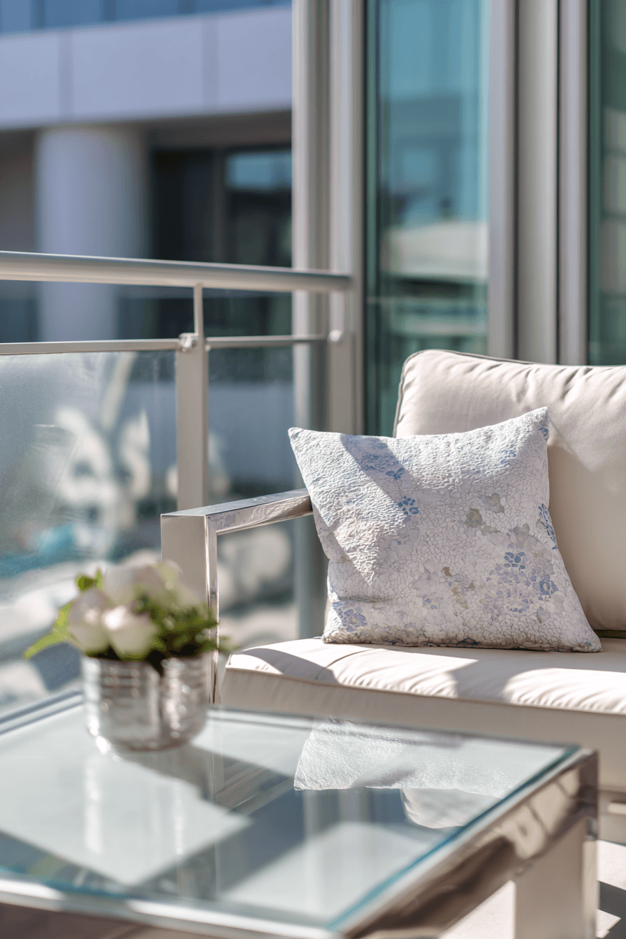 This setup highlights transparency with glass elements that make very small balcony decor feel open and expansive. Clear tables or railings allow light to flow freely, helping the entire space feel brighter and less confined. Pairing glass with soft fabrics like cushions or throws balances out the sleekness and keeps things cozy. The mood is calm and modern, with just the right amount of understated elegance. Keeping decor minimal lets the light and openness take center stage. Even a small reflective accent can amplify the airy feel. Tap to achieve this clean, open look.