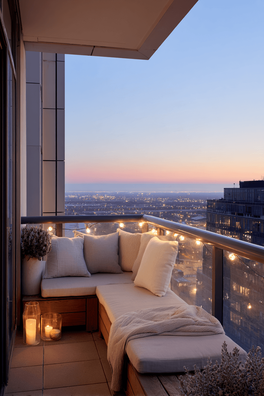 This dreamy setup frames the balcony as a peaceful edge of the city, enhancing very small balcony decor with soft lighting and gentle textures. Warm string lights or lanterns create a calming glow that instantly shifts the mood as the sun goes down. The palette stays soft and neutral, blending effortlessly with the skyline and surrounding views. Keeping furniture minimal allows the scenery to shine while still offering a comfortable place to sit. The mood feels serene with a hint of romance, perfect for quiet evenings or slow mornings. Subtle textures like light fabrics or smooth wood finishes keep everything feeling balanced. Tap to create this dreamy outdoor moment.