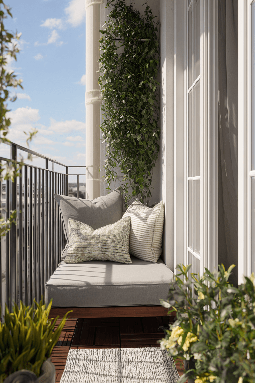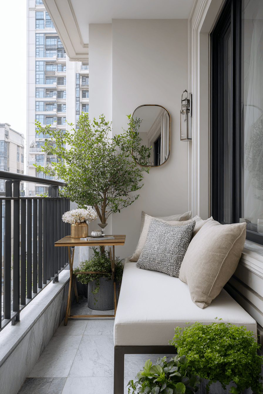 This narrow layout uses sleek materials and polished finishes to make very small balcony decor feel structured and stylish. Linear furniture, like a slim bench or narrow table, keeps the flow clean and easy to move through without bumping into anything. A mix of matte and glossy finishes adds subtle depth while still keeping everything cohesive. The palette blends soft neutrals with touches of metallics, like brushed gold or chrome, for a refined look that catches the light just right. Even a small mirror or reflective surface can help visually stretch the space. The mood is modern and efficient, but still warm enough to feel inviting. Discover how to style a slim balcony beautifully.