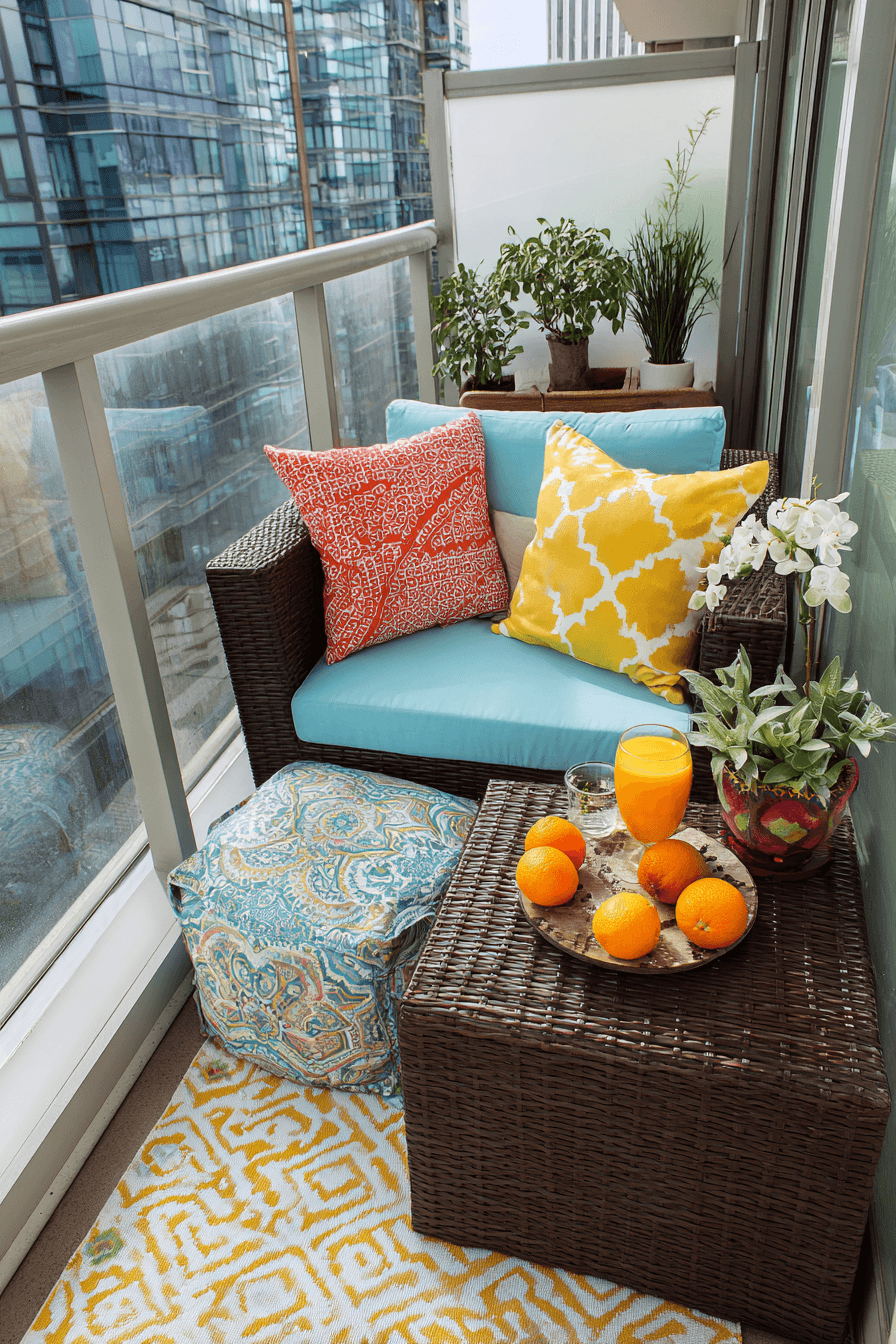 This vibrant design introduces bold accents and lively textures that energize very small balcony decor in the best way. Pops of color in cushions, planters, or even a patterned rug instantly bring personality without taking over the space. Keeping the base furniture simple allows those brighter elements to really shine. The layout stays compact, but the mix of textures—like woven fabrics or glossy ceramics—adds that layered, collected feel. The mood is cheerful and uplifting, making it a fun little escape right outside your door. Durable materials ensure everything holds up while still looking fresh and stylish. Click to add energy to your balcony space.