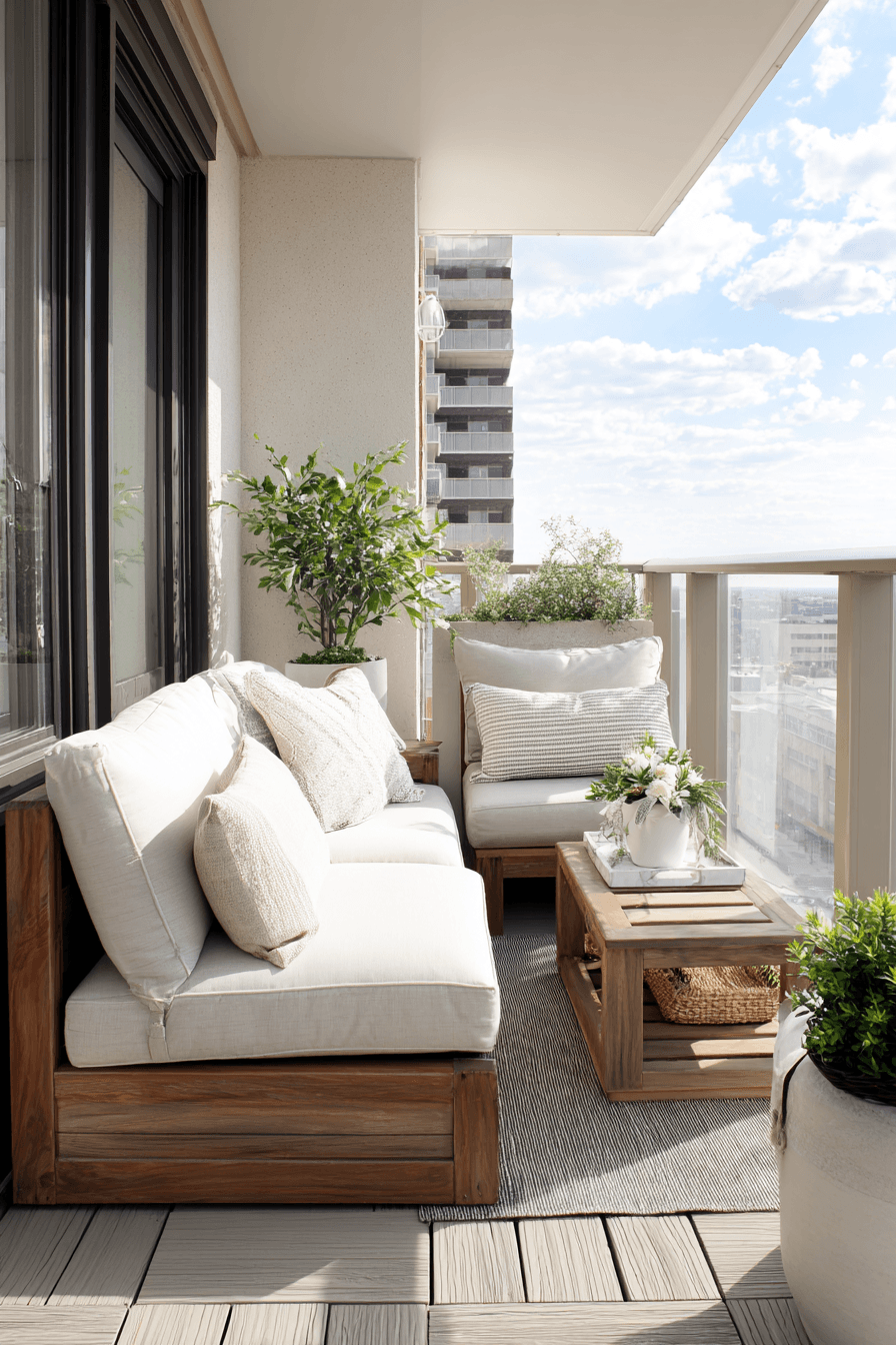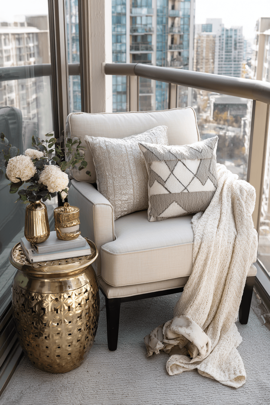 This look delivers high style through soft neutrals, textured fabrics, and a curated layout that enhances very small balcony decor. The light color palette creates an airy flow that visually expands the space and keeps it feeling open. Layered textiles like cushions and throws bring in warmth while still maintaining a clean aesthetic. Plush seating pairs beautifully with streamlined accents, adding depth without bulk or heaviness. The mood feels chic and inviting, making it perfect for both quiet moments and casual entertaining. Even a small side table can anchor the setup while keeping everything functional. Click to get inspired by this elevated small-space design.