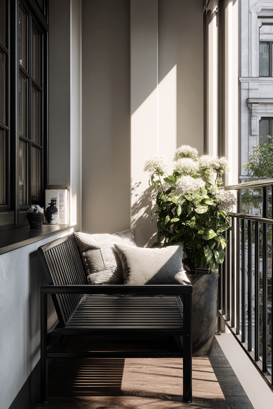 This design leans into clean lines and modern finishes, making very small balcony decor feel refined and purposeful. Slim-profile furniture in matte black or brushed metal adds a contemporary edge without overwhelming the space. A narrow bench or foldable chair keeps things flexible while still looking sleek. The mood is calm and elevated, with minimal styling that still feels intentional rather than empty. Smooth surfaces subtly reflect light, helping the balcony appear larger and brighter throughout the day. A few carefully placed accents, like a small lantern or sculptural planter, add personality without clutter. Tap to explore this sleek transformation.