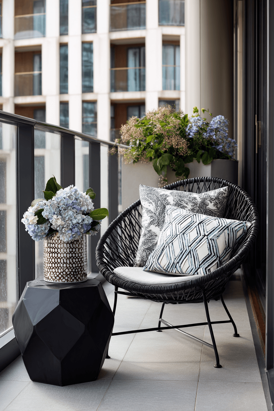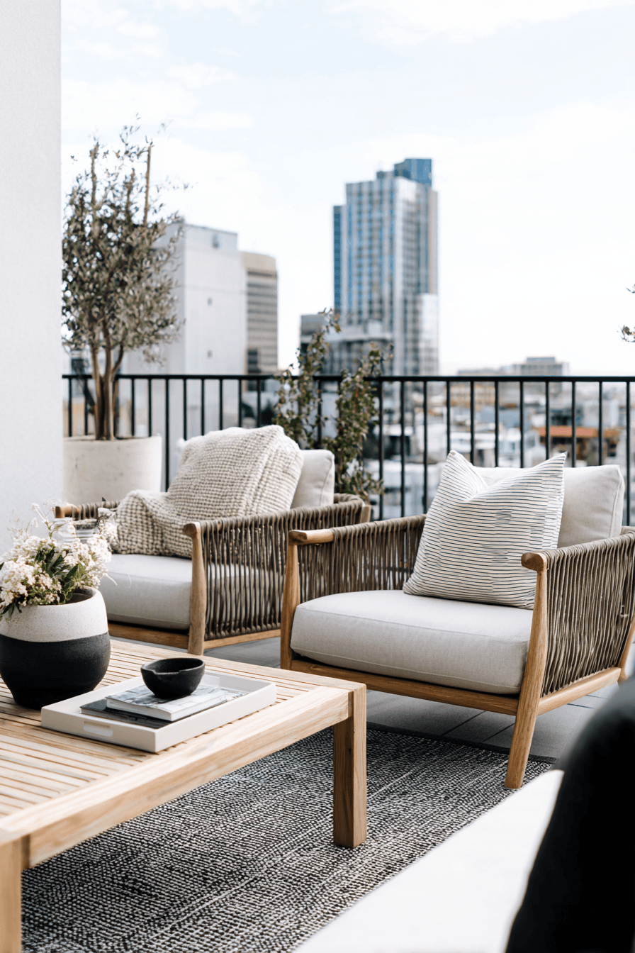 This stylish arrangement focuses on clean shapes and curated accents that make very small balcony decor feel intentional and trendy. A mix of soft textiles and structured furniture creates a balanced, modern aesthetic that feels put together without trying too hard. Adding a compact rug or a textured mat helps ground the space and makes it feel more like an outdoor living area. The mood is relaxed yet polished, offering comfort without sacrificing style, so it works just as well for morning coffee as it does for evening lounging. Neutral tones paired with subtle contrasts—like black frames against warm woods—keep the design visually interesting without overwhelming the eye. Even small decor touches, like a single sculptural planter or a chic tray, elevate the overall vibe. Discover how to style your balcony like a pro.
