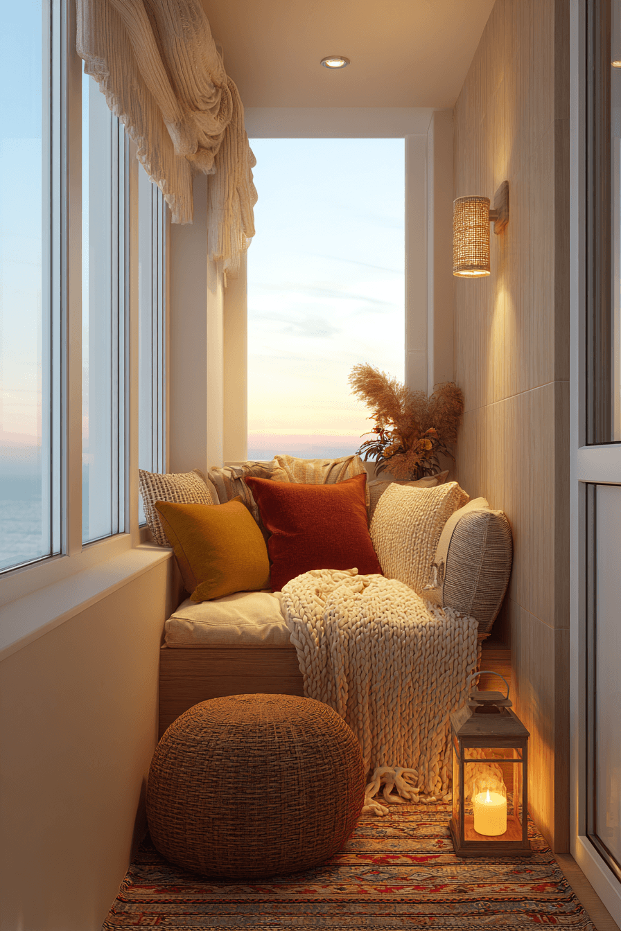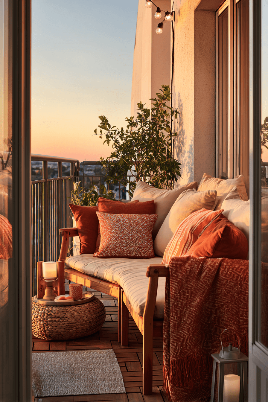 This warm setup highlights golden tones and sunset-inspired colors that enhance very small balcony decor with a cozy glow. Think soft terracotta, warm beige, and hints of amber that catch the light beautifully as the day winds down. Adding warm lighting, like string lights or a small lantern, makes the space feel even more inviting in the evening. Compact seating keeps everything comfortable without crowding the area. Layered textiles, like cushions or a light throw, add that extra sense of comfort. The mood is relaxed, cozy, and perfect for unwinding after a long day. Explore this sunset-inspired balcony idea now.