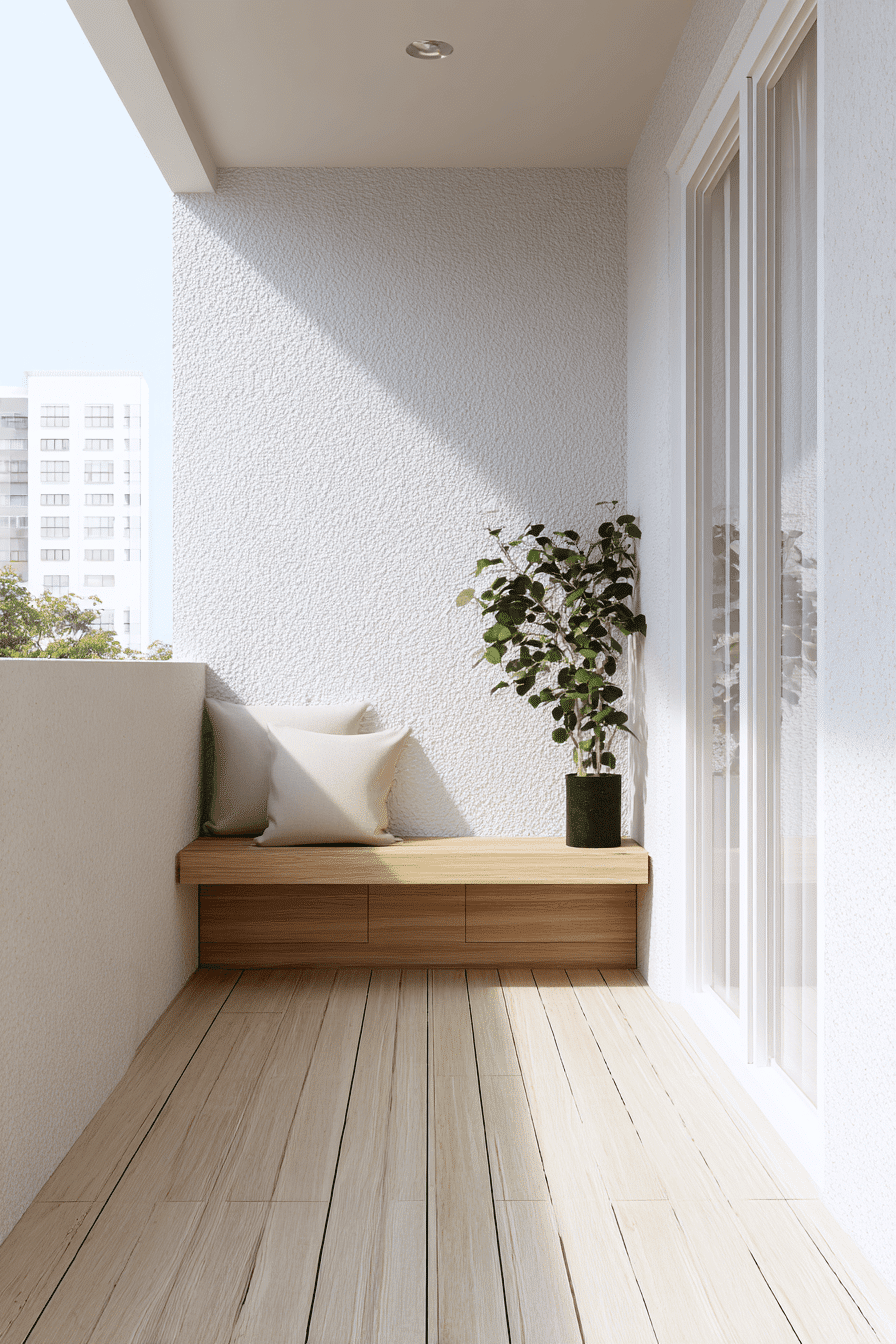 This minimalist approach highlights open space and clean styling to make very small balcony decor feel light and breathable. A simple color palette paired with streamlined furniture keeps the look uncluttered and easy to maintain. Choosing multi-functional pieces, like a bench with hidden storage, helps maximize every inch without adding visual weight. The mood is calm and refreshing, with an emphasis on simplicity and thoughtful design. Subtle materials like matte finishes and light wood tones enhance the airy feel without feeling cold. Even a single plant or decor piece can stand out beautifully in this setup. Explore this effortlessly clean balcony style now.