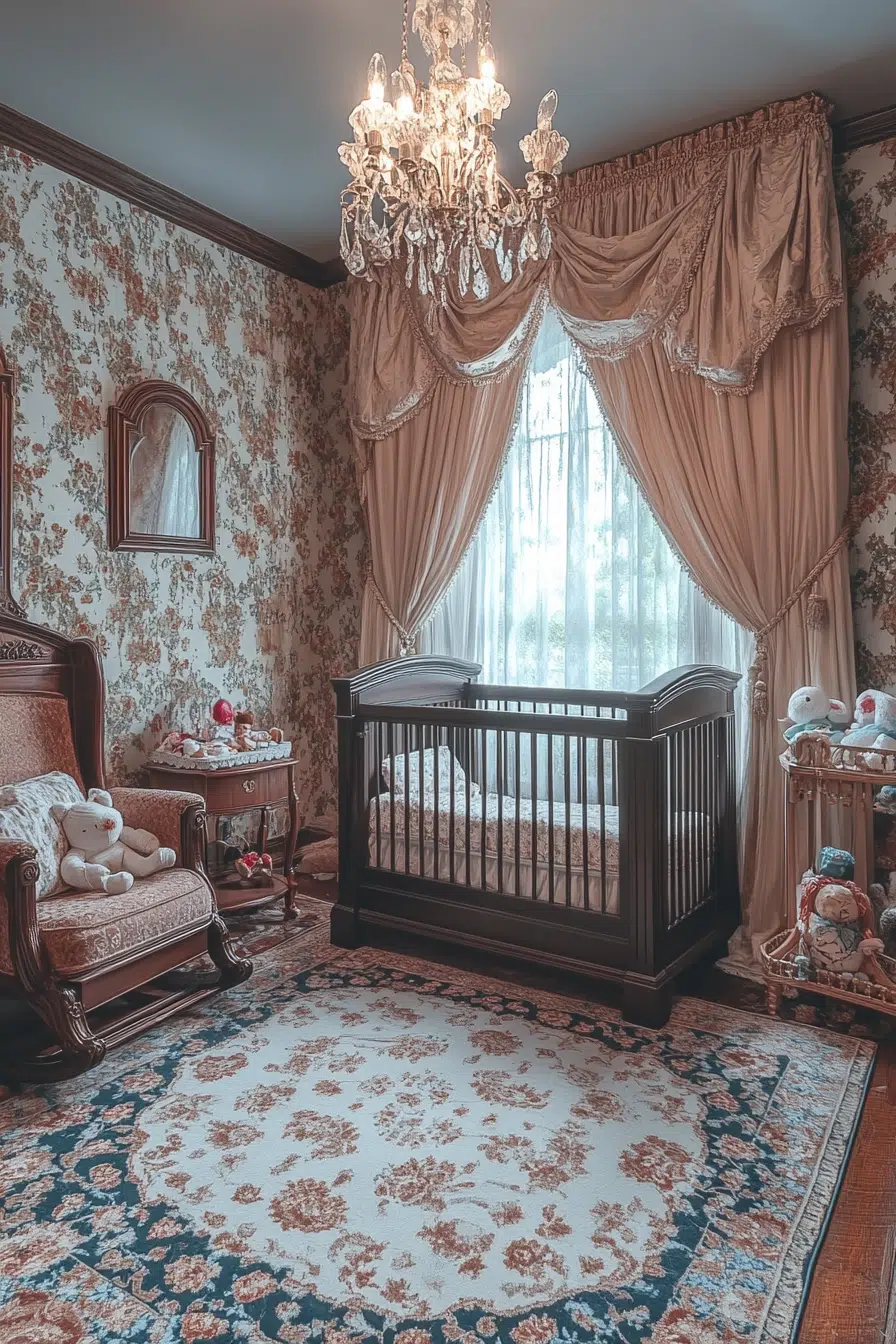 Transform your nursery into an Elegant Victorian setting with opulent fabrics and detailed wallpapers, crafting a vintage inspired nursery that feels both cozy and grand. Antique furniture and handcrafted lace add layers of luxury without the high cost. Embrace the charm of historical craftsmanship to create a serene and beautiful space for your baby.